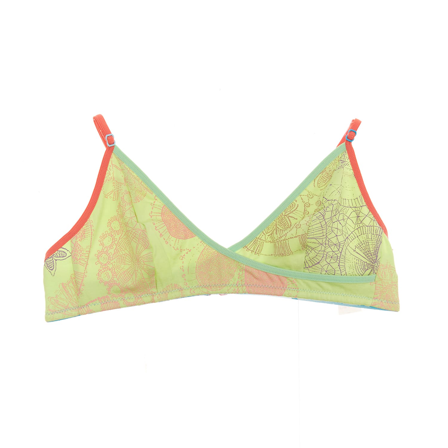 Crossover bodice with adjustable straps for a natural lift. This garment, like everything we make, is printed by hand and has unique color and pattern combinations that make it one-of-a-kind.